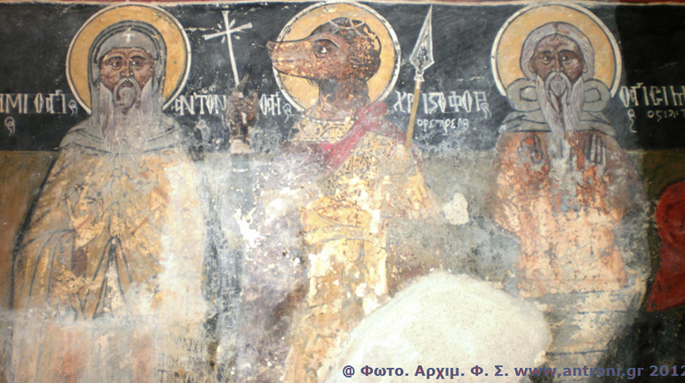 The Byzantine church of St. Anargyri has unique and remarkable frescoes. One of the frescoes of the church is Saint Andrew’s Dog (St. Christophoros), represents a Saint with a hound’s head and a human body. Next to it, there is a hagiography unfamiliar to the orthodox and Catholic churches under the title “Kyno-viharis“. Among the frescoes in the middle and right of the church there is Saint Christopher the Reservoir, with a dog’s head (probably a hunter) holding a cross in his right hand. It seems that the temple was an ancient breed of dogs ensuring food for the inhabitants, therefore they sanctified them. But it may well have been built on a pre-existing temple in an ancient cemetery. There is no more known information by the university community and the state, but the monument has been characterized as Byzantine antiquity.